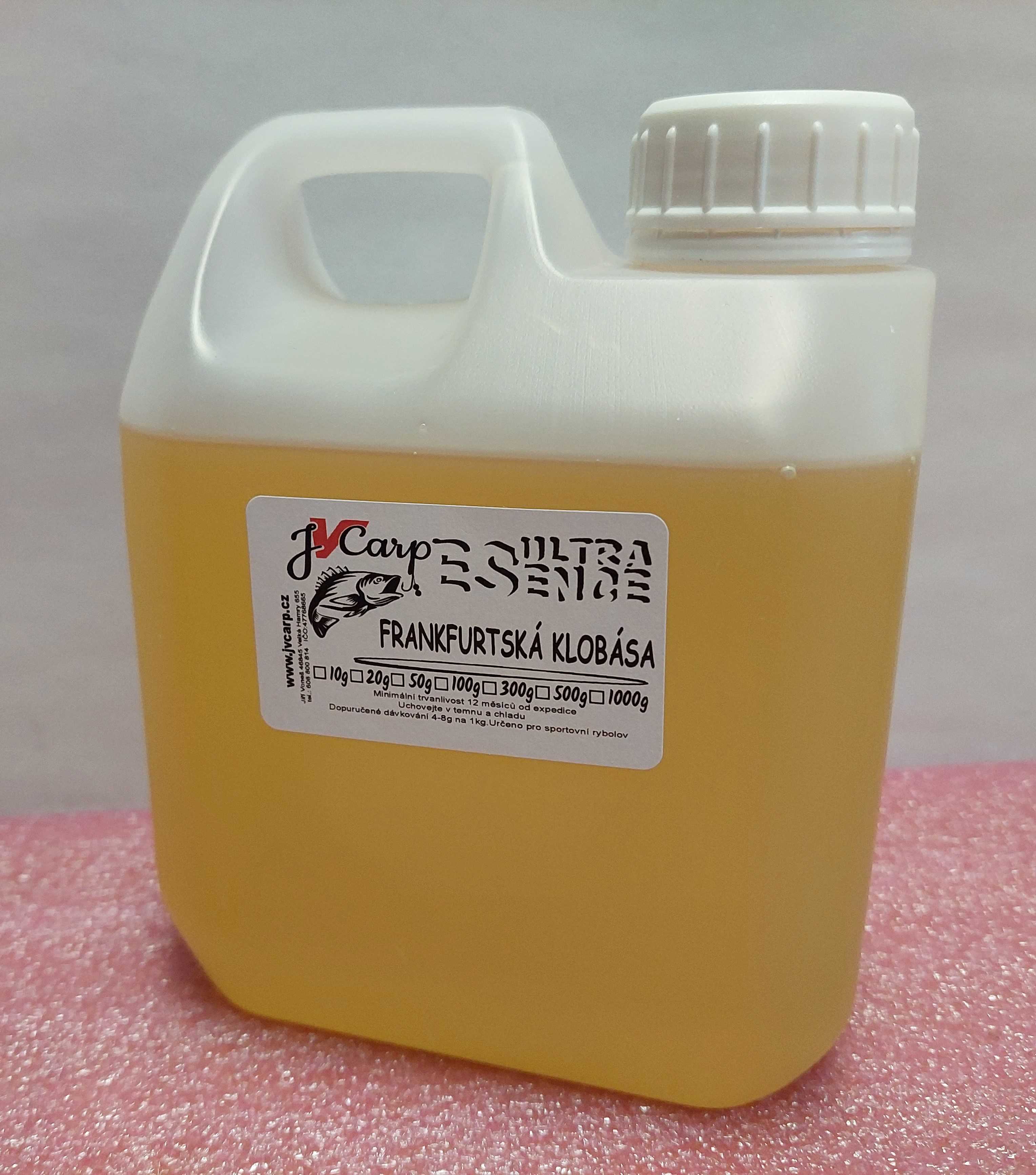 Esence frankfurtsá klobása má neuvěřitelně silné aroma, směs olejů, česneku a koření.  Frankfurtská klobása je velmi oblíbenou příchutí.  -Doporučené dávkování na kilogram 3-6 ml -Na olejové bázi celý popis